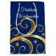 Ce sac cadeau de grande taille est présenté dans un tourbillon fantaisiste de couleur dorée avec le texte Joyeux Noël sur le devant. Montré en bleu saphir et or. Texte au-dessus de Frohliche Weihnachten. Customisez ce sac ou achetez comme indiqué.