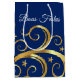Ce sac cadeau de grande taille est présenté dans un tourbillon fantaisiste de couleur dorée avec le texte Joyeux Noël sur le devant. Montré en bleu saphir et or. Texte au sommet de Boas Festas. Customisez ce sac ou achetez comme indiqué.