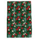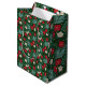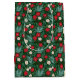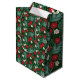 Des poinsettias de Noël brillantes sur un sac cadeau assorti.