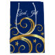 Ce sac cadeau de grande taille est présenté dans un tourbillon fantaisiste de couleur dorée avec le texte Joyeux Noël sur le devant. Montré en bleu saphir et or. Texte au sommet de Dieu juil. Customisez ce sac ou achetez comme indiqué.