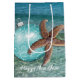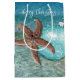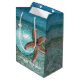 Sac cadeau de Noël tropical. Poisson étoilé et ornement d'arbre en marron et bleu, avec blanc, texte script pour customiser de part et d'autre. L'eau de mer est l'image arrière - plan omniprésente. Pour ceux qui fêtent dans un climat chaud.