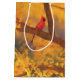 Dans un érable jaune vif, un cardinal mâle perche, en surveillant son compagnon sur le mangeur d'oiseaux voisin.