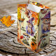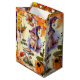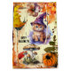 Joli sac cadeau avec un chaton déguisé en sorcière d'Halloween, entouré de feuilles colorés, de champignons et d'un citrouille avec araignée. Grand comme un cadeau ou pour des gâteries : -)