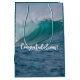 Sacoche cadeau en papier avec conception d'ondes océaniques. Ajoutez "Félicitations" ou "Joyeux Anniversaire" ou n'importe quel texte à l'avant. La couleur est bleu-vert océan avec du texte blanc et est disponible en trois tailles. Le texte long ne s'adapte pas au sac vin/bouteille. Parfait pour les hommes ou les femmes et pour la plupart des occasions.