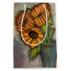 Des fleurs aux couleurs vives aux contours audacieux sont disposées dans un vase bleu, dégageant une atmosphère animée et vibrante. L'arrière - plan est décoré dans des tons doux et feutrés, qui rehaussent l'éclat des pétales et des feuilles des fleurs.