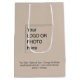 Élevez vos cadeaux d'entreprise avec notre élégant sac de shopping / sac cadeau moyen beige clair, mettant en valeur votre logo ou photo et un texte personnalisable en noir classique.