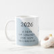 2026 Universal Year of Change and New Beginnings Motivational Quote Coffee Mug - Resolution Number 12... In Numerology, the year 2026 is a "Universal One Year" with the numbers (2+0+2+6) adding up to 10, which reduces down to 1. The number One represents change, new beginnings, originality, and new understandings, personally and globally. Some of us welcome change; others fear it, resist it, and attempt to stop it from happening, whether on a personal, nationwide, or global level. My aim with this collection of motivational mugs is to help you set your intentions (or New Year's Resolutions) for 2026 to ease the way during the chaos that can occur when major changes are taking place both within you and all over the world at the same time. Overlaid on geometric shapes in a lovely light dusty blue color, the text on one side of the mug reads "2026 A year of change and new beginnings" with the intention on the other side "This is the year I will always choose truth over expedience and trust my own powers of perception". You can revise this text, if you like, and also personalize the mug with your name and monogram initial by selecting "Details" where it says "Personalize this template". The intention text is adapted from an original saying by Barbara Casey.