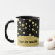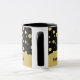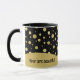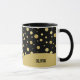 Chic tasse pour les amateurs de mode, ce design est composé d'un motif à pois dorés sur un arrière - plan noir contrasté. Modifiez simplement l'exemple de texte avec votre texte ou votre nom de l'autre côté.