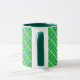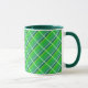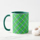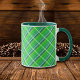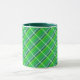 Un mug à café avec un motif à carreaux vert frais et prépa avec de petites rayures blanches et bleues.