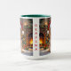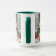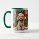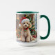 An adorable personalized Christmas coffee mug with a festive poodle sitting in front of the fireplace on a cold winter day. A Christmas tree decorated and a festive background.