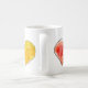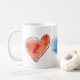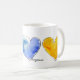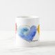 Trois coeurs aquarelle sur une tasse de café. jaune doré, bleu vrai et rouge vif. PERSONNALISER en appuyant sur le bouton personnaliser. Ajoutez votre propre message personnalisé, choisissez parmi plusieurs polices, de formel à décontracté. Changez le style de la tasse, obtenez des couleurs d'accent ou la chaleur disparaissant.