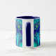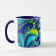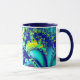 La mug combo bleue Abstraite présente des oeuvres d'art fractal aux couleurs vives (bleu, cyan, vert et violet).