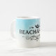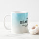 Tasse de café pour les amoureux de la plage avec une plage aquarelle et le mot "accro à la plage" avec des éléments d'accent, icône de tongs