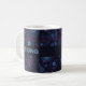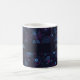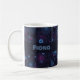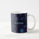 A blue & purple, geometric flower pattern on a mug. Use "Personalize this template" to change the "Fiona" text/name and create a unique, customized gift. A stylish mug featuring my original geometric floral pattern, with a selection of flowers including: Japanese anemones, daffodils, violets, pansies, daisies, roses, Michaelmas daisies, cinquefoils, primroses, buddleia, clematis, gardenia, phlox and forget-me-nots. The print is light blue with a subtle purple behind on a dark blue background.