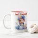 Cette tasse rose de 2e anniversaire combine du texte cursif et imprimé avec un graphique carré accompagnant ce qui semble être un enfant ou une poupée avec des cheveux moelleux à l'avant central. Le design de la chemise suggère qu’elle pourrait être conçue comme une tenue décontractée ou comme une pièce d’occasion spéciale, la boue du 2e anniversaire, adorable pour les jeunes enfants.