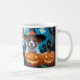 Une scène d'Halloween ludique avec un petit chiot espiègle regardant d'un citrouille sculpté, entouré de vibrations d'automne éffrayantes et amusantes. Avec un charme fou et des couleurs automnales, c’est la touche d’humour parfaite pour la saison.