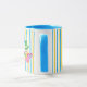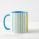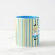 Cute Alice in Wonderland tasses personnalisées pour une fête de thé d'anniversaire à thème de livre. La petite fille Alice dans sa robe bleue et le chapeau Mad s'assoient sur une jolie bande jaune bleue. Customisez ce décor fantaisiste de fête avec votre propre texte.