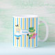 Cute Alice in Wonderland tasses personnalisées pour une fête de thé d'anniversaire à thème de livre. La petite fille Alice dans sa robe bleue et le chapeau Mad s'assoient sur une jolie bande jaune bleue. Customisez ce décor fantaisiste de fête avec votre propre texte.
