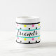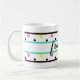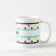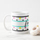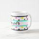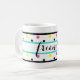 Friends est écrit en élégant noir script centre de tasse. Formes géométriques colorées avec rayures noires et turquoise. Des pois colorés roses, jaunes et noirs dansent pour un look moderne et frais. Personnalisez avec votre texte initial monographique ou autre, ou supprimez la zone de texte pour laisser vide. Formes circulaires fraîches et tendance pour la vaisselle de cuisine du printemps ou d'été. Design original © TamiraZDesigns. www.zazzle.com/tamirazdesigns