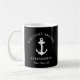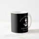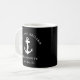 Une tasse moderne au thème nautique pour votre bateau qui dispose d'une ancre blanche sur un arrière - plan noir. Vous pouvez personnaliser le texte "Welcome Aboard" et le nom et l'emplacement de votre bateau dans une élégante typographie et un script blanc.