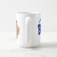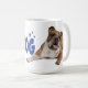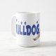 Cette tasse à café canine amusante comporte un chien chiot de Bulldog anglais brun et blanc avec Bulldog imprimé dans une police de coeur bleu et audacieuse surlignée d'un arrière - plan blanc immaculé.