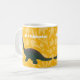 Créez un cadeau personnalisé qui conviendra parfaitement aux amateurs de dinosaures jeunes et vieux. Cette tasse présente une photo d'un jouet en plastique apatosaurus dinosaure en vert avec des accents rouges rouille contre un arrière - plan jaune vif avec un motif de fossiles d'empreintes de dinosaures. Ajoutez votre propre nom ou autre texte en caractères gras blancs.