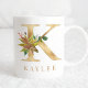 Une tasse à café personnalisée avec un faux monogramme "K" de la lettre d'or, avec des illustrations décoratives d'aquarelle florale et feuillage. Customisez facilement avec votre nom ou créez un cadeau unique pour vos proches.