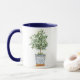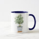 Tasse à café avec une aquarelle illustrant un olivier aux branches d'olivier luxuriantes éparpillées sur l'image. L'arbre est planté dans un planteur bleu et blanc. Image imprimée des deux côtés. Des tailles et des tailles de jante et de poignée supplémentaires sont disponibles.