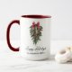 Élégante Calligraphie moderne Encre Script Aquarelle Pins Végétation hivernale avec Burgundy Rouge Ribbon Bow Ornements de Noël, Pine Cônes et Baies Saintes Joyeuses Vacances Grand Café Mug