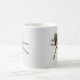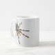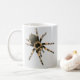 Mug, tasse à café. Un mur de briques blanches. Une araignée mygale (Brachypelma smithi) est représentée comme si elle était posée sur ce mur. L'araignée a un corps poilu brun-gris avec des pattes orangées, donnant une impression de réalisme tridimensionnel