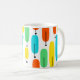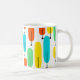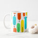 Cette tasse a un design moderne du milieu du siècle de longs ovales en jaune, orange, vert et turquoise avec des lignes noires avec des cercles sur les extrémités.