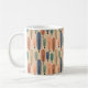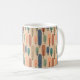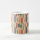 Cette tasse a un design moderne du milieu du siècle de longs ovales en pêche, vert, bleu, turquoise, et brun clair avec des lignes noires avec des cercles sur les extrémités.