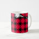 Cette tasse a un design moderne du milieu du siècle de diamants noirs solides à l'intérieur des contours de diamants noirs avec des lobs roses sous eux, le tout sur un champ de blanc.