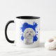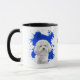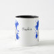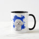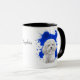 Un beau portrait d'eau d'une adorable Bichon Frise blanche se détache sur un arrière - plan abstrait de peinture bleu vif. L'image est sur deux côtés de la tasse, avec votre nom ou autre texte personnalisé en noir entre eux.