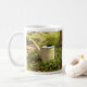 Vintage Watering Can In A Patch Of Vinca, est une photo prise dans mon jardin. La canette d'arrosage vintage est entourée de taches de couverture. J'ai pris la photo d'origine et ajouté des effets spéciaux, pour obtenir le mouvement tourbillonnant. Cette image s'affiche à l'avant et à l'arrière de la tasse. Le texte vertical du milieu, "I LOVE TO GARDEN", peut être personnalisé avec votre propre texte.