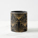 Cette tasse a un design Art Déco de diamants et de triangles en or sur un champ de noir.