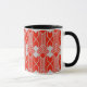 Cette tasse a un design art déco de formes et de lignes diamant sur un champ de rouge.