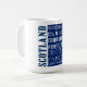 Coffee mug présente sous la forme d'un graphique de métro de sept des plus grandes villes d'Écosse en fonts bleu et blanc.