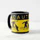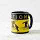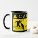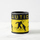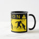Signal de prudence jaune et noir avec un poisson essayant de manger une figure de bâton.