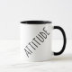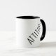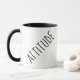 ATTITUDE écrite en caractères gras, noirs, modernes, en caractères de police écrite en diagonale sur le visage et le dos et cette tasse. Ce design est disponible en plusieurs couleurs et styles.