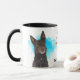 Un portrait d'un chien Kelpie australien attentif est la caractéristique de deux côtés de cette tasse. Chaque image est placée sur un arrière - plan à bec bleu vif. Entre les deux images est le texte qui décrit ce compagnon loyal et énergique, avec "le chien KELPIE" en noir au fond. Tout le texte est facilement customisé à tout ce que vous voulez afin que vous puissiez décrire votre propre ami loyal.