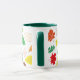 Cette tasse à café est ornée d'un motif d'automne coloré avec des feuilles verts, jaunes, oranges et bruns sur un arrière - plan blanc.