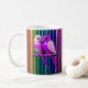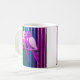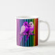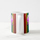 Un mug multicolore décoré, deux canaris serrés l'un contre l'autre, perchés sur leur perchoir, le décor est multicolores. Une histoire d'amour haute en couleurs.