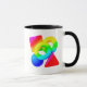 Un mug jaune et blanc avec des formes géométriques tout en couleurs vives, jaune, vert, rouge et bleu qui forment un ensemble multicolores.