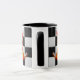 Un mug avec fond d'image style plateau d'échec, les carreaux noirs et blancs avec reflets de lumière apportent une touche réaliste. Un petit lapin en 3D est assis dans cet univers géométrique. Il est assis au milieux des carrés, avec un léger sourire. Le lapin également en trois dimensions.