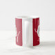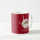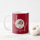 This festive Baby Boy's First Christmas Photo mug is decorated with the word JOY on a maroon-red background.