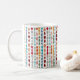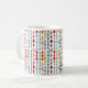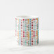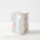 Cette tasse présente un design moderne du milieu du siècle, composé de cercles et d'ovales entrecoupés de couleurs rétro entrecoupés sur un champ de blanc.