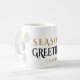 Mug café de vacances | Noir et or moderne minimal vacances Baubles - trois ornements de Noël rayés noir et or pendent à des niveaux différents de chaque côté du texte "Saison"s Salutations ' - dans une police pour rendre ce cadeau attrayant pour des amis de famille ou d'affaires - customisez facilement avec votre nom - ceci fait partie de la collection de Baubles de vacances minimaux Noir et Or moderne