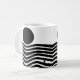 Cette tasse a le design Bauhaus de lignes ondulées et cercles en noir sur un champ de blanc.