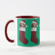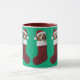 A cute Christmas mug featuring a Beagle wearing a Santa hat sticking out of a Christmas stocking.